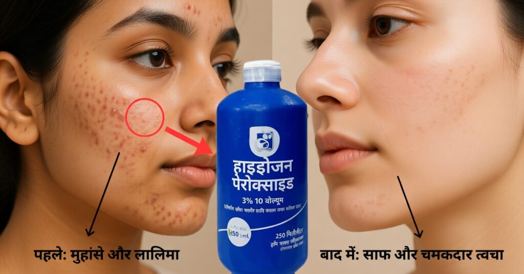 • ऑक्सीजन युक्त पानी (हाइड्रोजन पेरॉक्साइड): हल्का ब्लीचिंग करता है, कीटाणुओं को नष्ट करता है और सेल रीजेनेरेशन को सपोर्ट करता है।