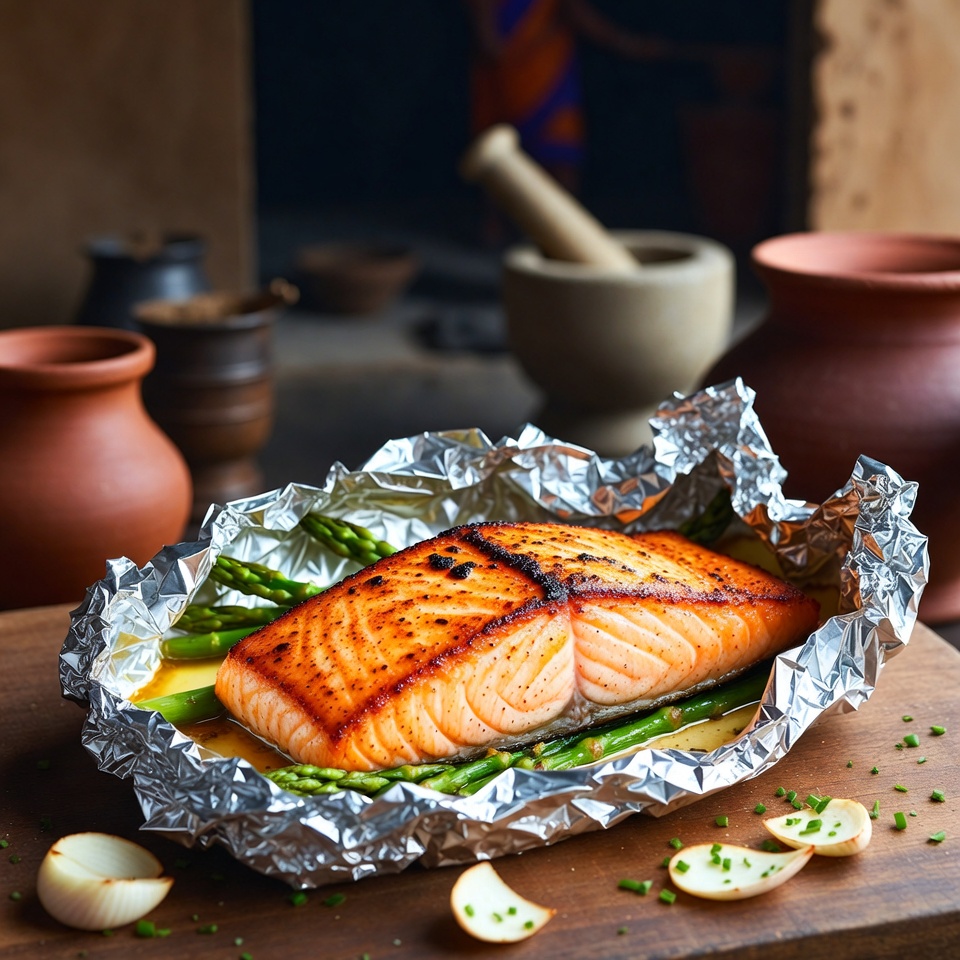 यह आसान और स्वादिष्ट रेसिपी सैल्मन, ताज़े एस्पैरागस, नींबू, लहसुन और पार्मेज़ान चीज़ के बेहतरीन मेल से तैयार होती है। फॉइल में पकाने से स्वाद अंदर ही बंद रहता है और मछली बेहद नरम व रसदार बनती है।