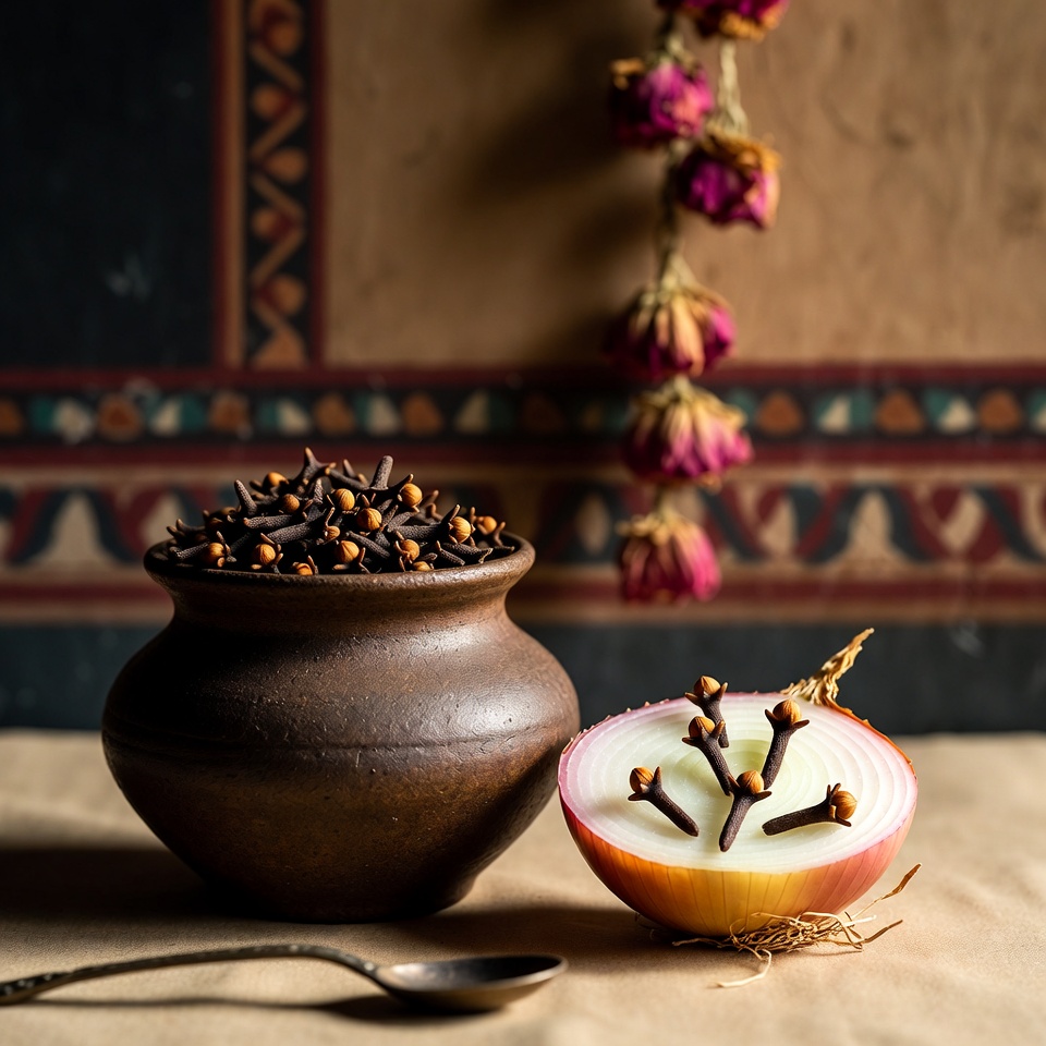 - प्याज़ यहाँ सुगंध फैलाने का माध्यम (डिफ्यूज़र) बन जाती है, जो समय के साथ धीरे-धीरे लौंग की खुशबू छोड़ती रहती है।
