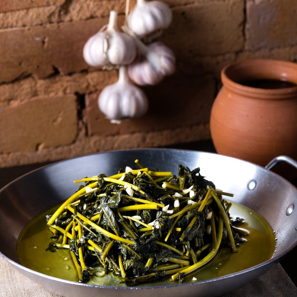 लहसुन और जैतून के तेल के साथ हल्का तला हुआ जंगली मॉलो साग