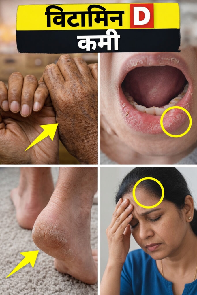 हाथों की त्वचा सूखी, झुर्रीदार या खुरदरी लगना और एड़ियों का बार-बार फटना भी एक संकेत हो सकता है। विटामिन D त्वचा की सुरक्षा परत और नमी बनाए रखने की क्षमता को प्रभावित कर सकता है। इसकी कमी कुछ लोगों में त्वचा को अधिक शुष्क बना सकती है।
